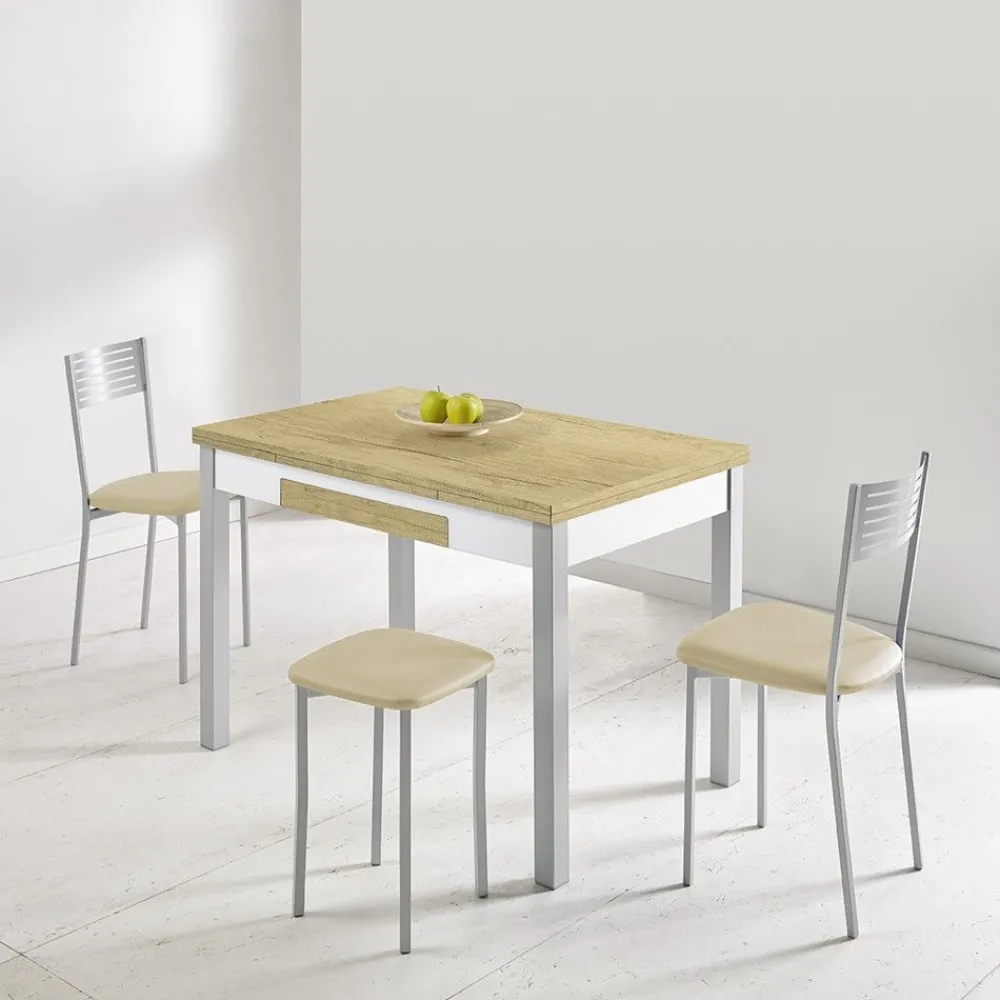 La mesa de cocina extensible Málaga, dispone de un amplio cajón en el lateral de la mesa. Se puede hacer más grande gracias a los extensibles frontales que dispone. Está disponible en dos tamaños diferentes. Las patas se pueden también cambiar de color