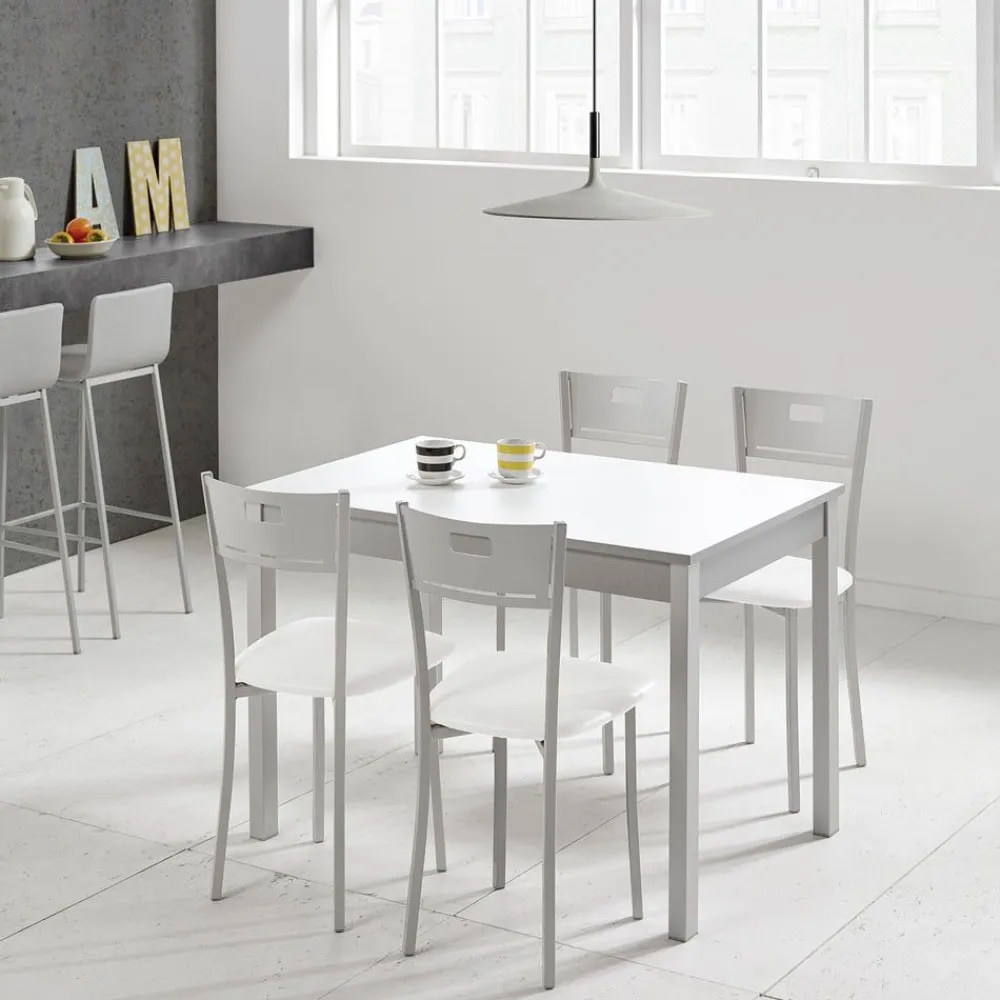Una mesa de salón o una mesa de cocina, por su diseño moderno y minimalista, la puedes usar donde quieres. Disponible en dos tamaños, es una mesa resistente y duradera, con encimera en laminado blanco y armazón en laminado aluminio. Las patas son metálicas y puedes elegir su color entre aluminio y blanco texturizado.