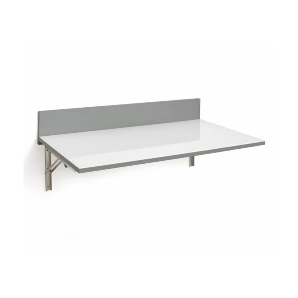 La mesa de pared abatible Zaragoza ocupa muy poco espacio en tu cocina cuando está cerrada. Cuando está cerrada queda como una pequeña barra de 12 cm de fondo y 90 cm de ancho. Cuando la abrimos se despliega una encimera de laminado blanco de 50 cm de fondo.