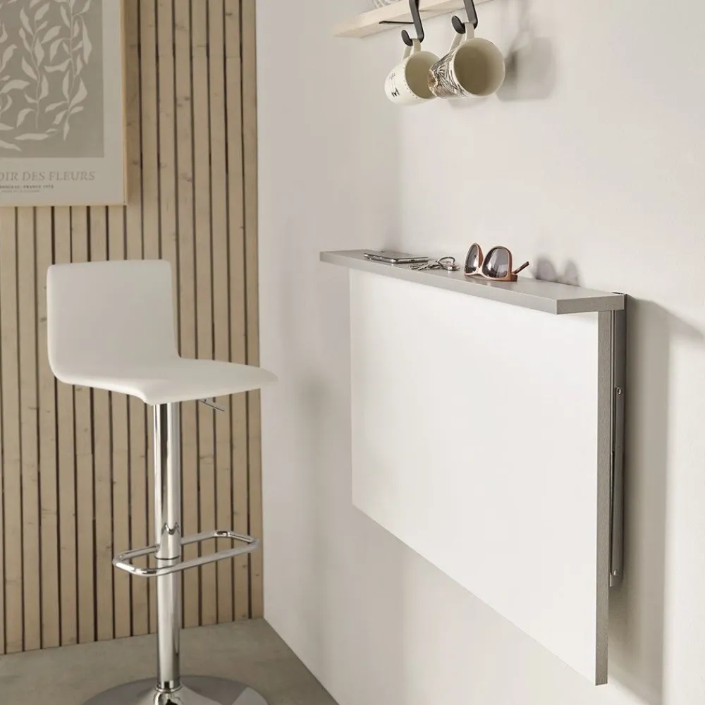 La solución perfecta para añadir una mesa de cocina en espacios reducidos, es la . Se trata de una mesa que va colgada en la pared y cuando está cerrada, ocupa apenas 12 cm de fondo y 90 cm de ancho, quedando la encimera pegada a la pared, como una pequeña barra.