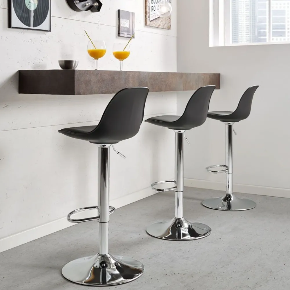 Para las cocinas con una isla o una barra americana, los taburetes de gas o hidráulicos son una opción perfecta, regulables en altura para que lo subas o bajes dependiendo de tus necesidades. El taburete Marta de estructura metálica en color cromo brillo y respaldo y asiento en polipropileno negro.