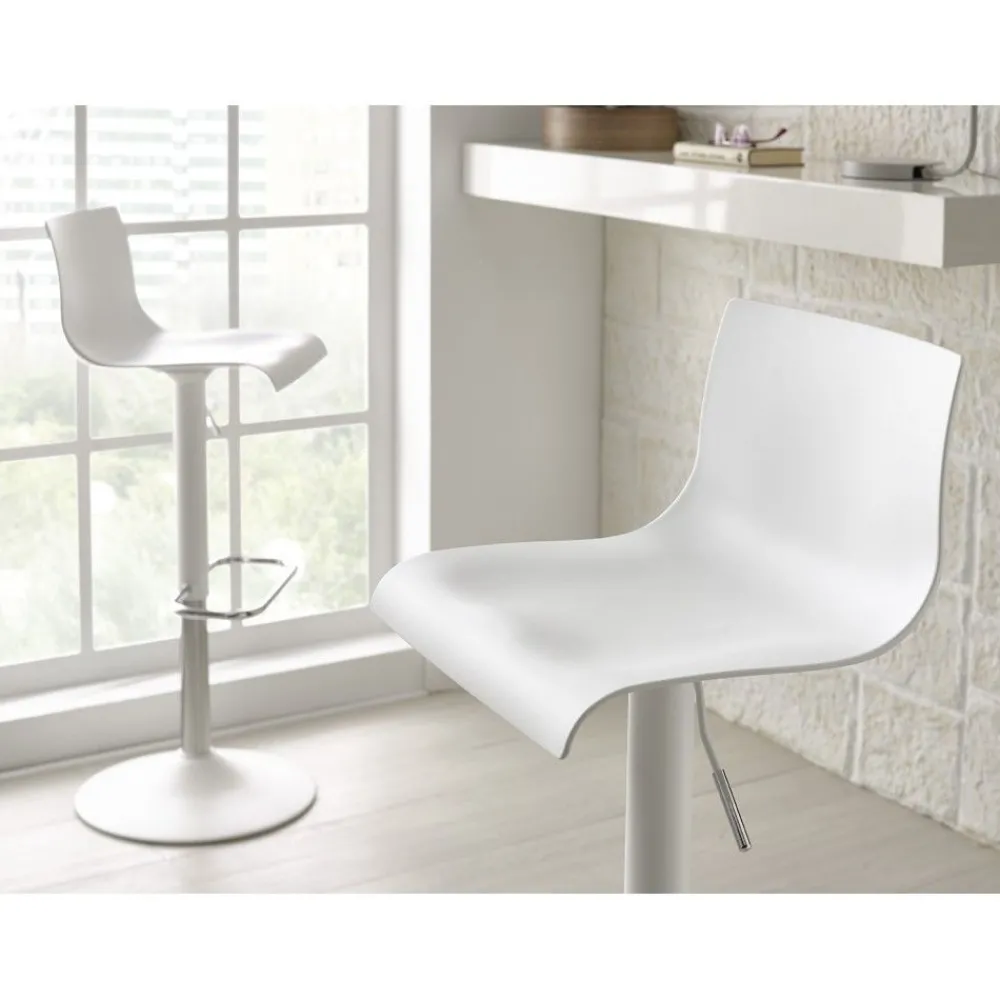 El taburete de cocina elevable Nicola está fabricado con un armazón metálico en cromo brillo, de gran resistencia. Tanto el asiento como el respaldo están realizados en polipropileno en color blanco.